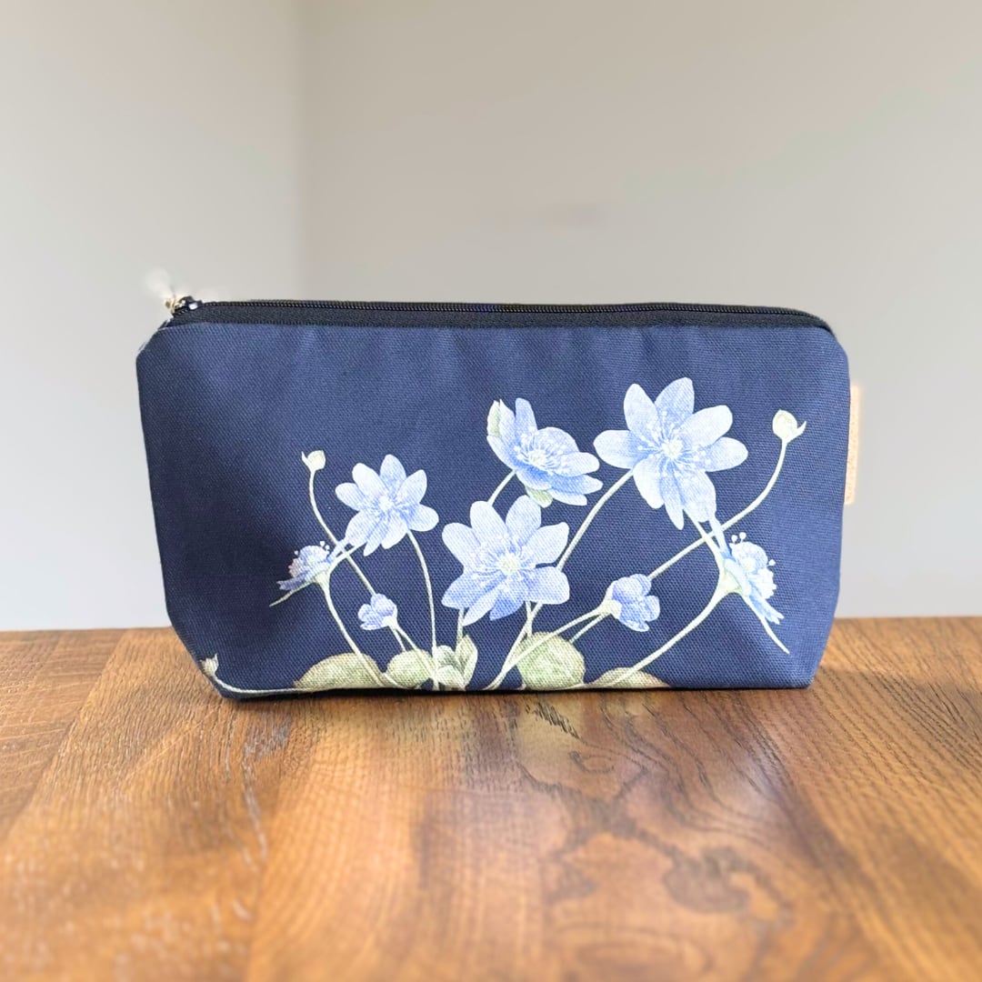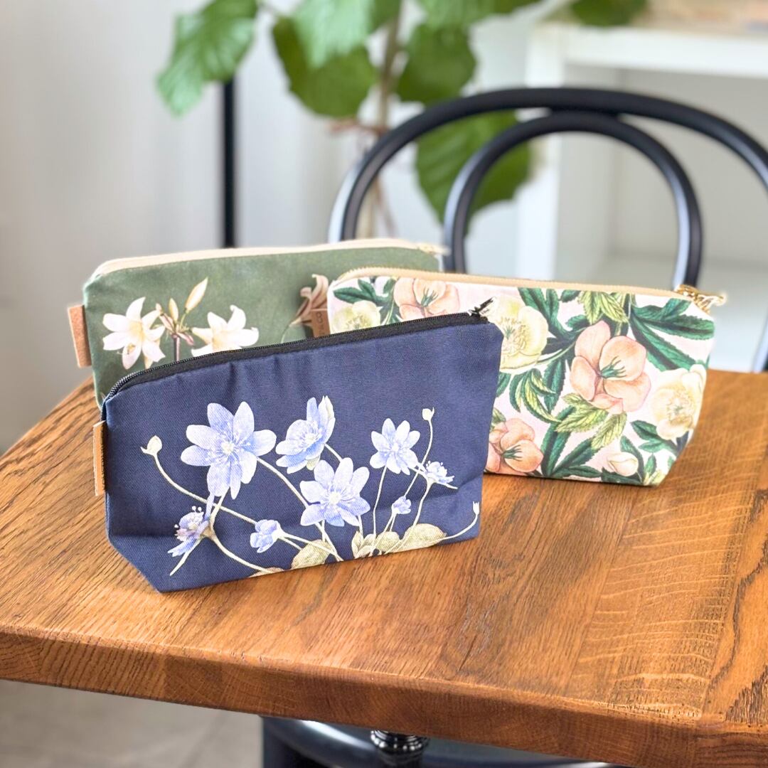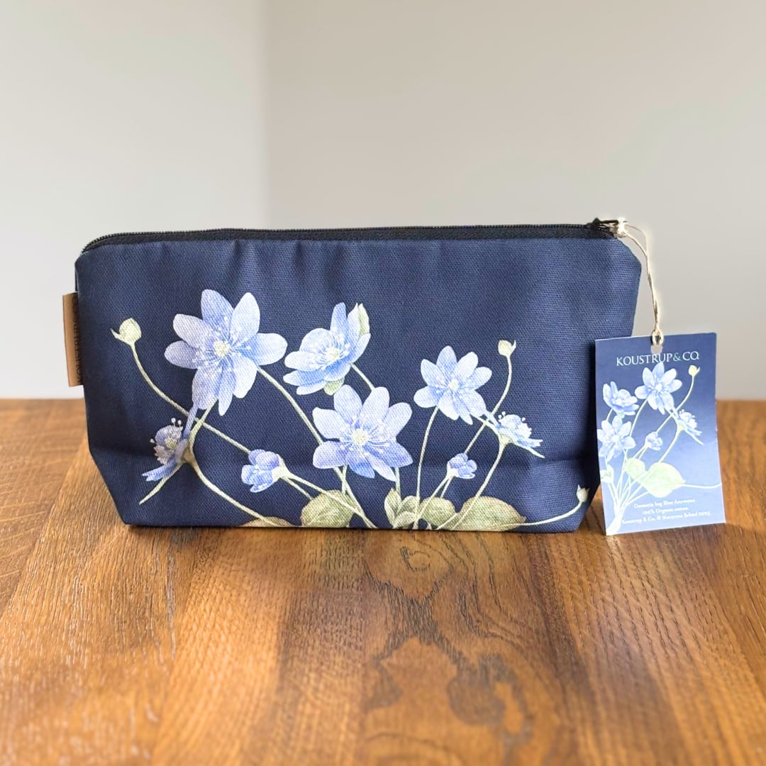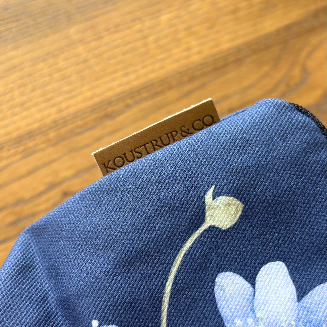 深いダークブルーにブルーアネモネが静かに描かれた、Koustrup & Co.のコスメティックポーチ。